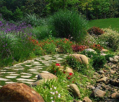此處的花園以代表浪漫的粉色、紫色為主調(diào),配以白色、黃色 的芒草、銀葉點(diǎn)綴,形成了色調(diào)輕柔、優(yōu)雅而統(tǒng)一的氣質(zhì)。由于花境 要求立面美,因此花境植物應(yīng)選擇植株較高、花序和花朵垂直分布 在植株上的花卉,如:鼠尾草、鳶尾、大花蔥、蜀葵、宿根飛燕草、 百合類、蛇鞭菊、翠雀花等。植物沒有高低 貴賤,關(guān)鍵在于搭配,因地制宜,選擇鄉(xiāng)土樹種為主。