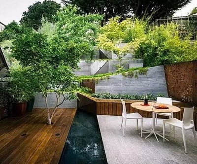 下沉式別墅庭院設計的特點是在正負零的基礎上下躍一層,同時,附帶了很大面積的室外庭院。這樣一來,地下一層借助外庭院的采光,就相當于地上一層。再加上做了采光井,地下室的采光基本不成問題,既能夠享受到室外的花園景觀又給地下一層提供充足的采光。