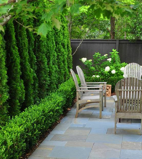 最后就是在視線觸及范圍種植灌木(如:金銀木、丁香、天目瓊花等)和綠籬(如竹子、北海道黃楊等)。具備了以上的三個(gè)層次,就可以打造出一個(gè)私密的花園空間。
