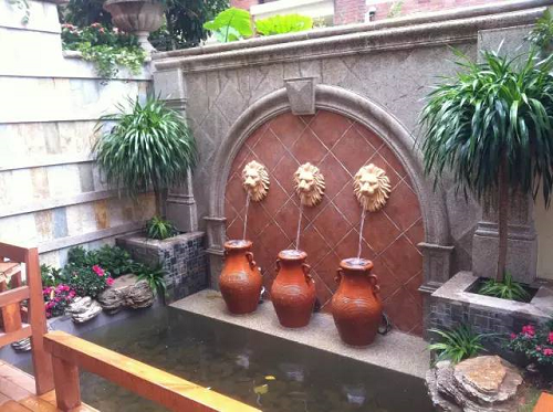常見(jiàn)的噴泉在私家花園里經(jīng)常會(huì)和雕塑、小品、花壇、盆景結(jié)合一起;為我們所熟悉。壁泉是從壁面上流下來(lái)的泉水。它是園林中室內(nèi)外滲透手法之一,其構(gòu)造分壁面、落水口與受水池三部分。壁泉的落水形式可以依水量而定;可做成片狀落(水簾),柱狀落和淋落(滴泉落)。